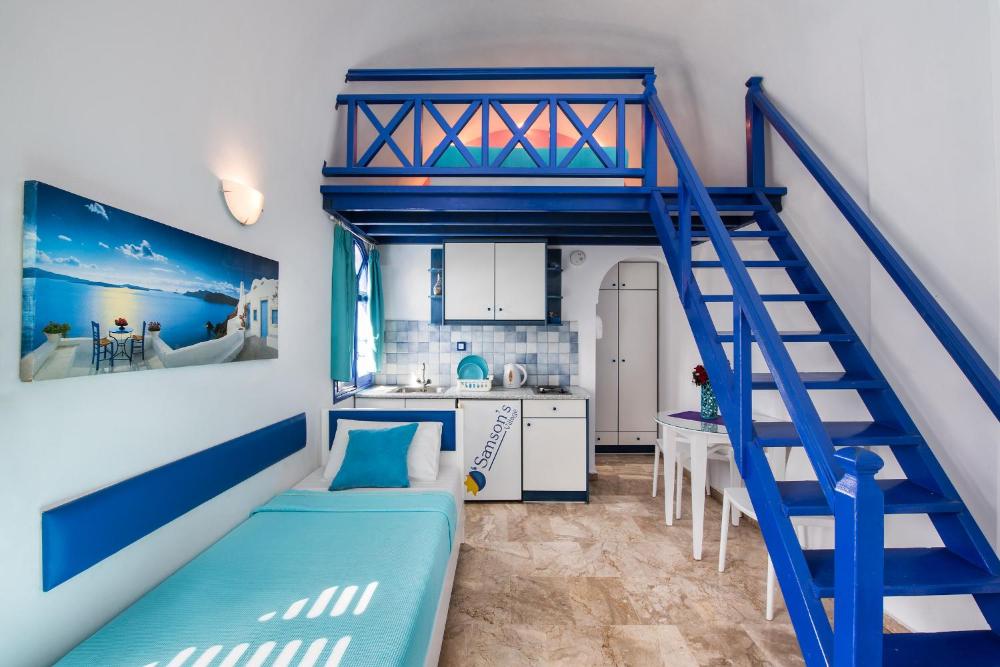 Le Samson's Village vous invite à séjourner dans des hébergements traditionnels décorés dans le style des Cyclades et offrant une vue sur la mer. Il propose une connexion Wi-Fi gratuite et se trouve à seulement 2 minutes de la plage de Perissa. Rénovés en 2012, les studios et les appartements du Samson affichent une décoration traditionnelle et comprennent une kitchenette, ainsi qu'un balcon donnant sur la mer Égée ou la piscine. Ils sont tous équipés de la climatisation et d'une télévision par satellite. Le complexe possède une piscine dotée de transats et d'un bar. Vous pourrez vous détendre au bar, ou naviguer sur Internet dans l'espace de connexion Wi-Fi gratuit situé à proximité. L'établissement sert un petit-déjeuner continental. La station balnéaire très prisée de Perissa possède l'une des plages les plus impressionnantes de la mer Égée. Les amateurs de sites archéologiques pourront emprunter le sentier long de 2 km passant à travers les montagnes de Profitis Ilias et de Mesa Vouno jusqu'aux ruines de l'ancienne ville de Théra.